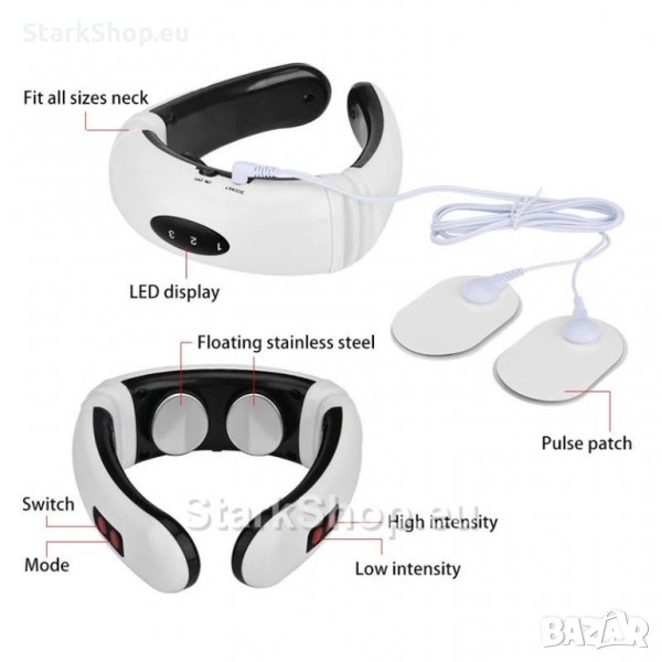 Представяме Ви електромагнитен масажор за врат.Той излъчва електроимпулси, чрез които облекчава болката в раменете и гърба. Просто го включете и поставете на врата си и той ще докосне ключови точки и ще усетите приятен облекчаващ електромагнитен масаж. Подходящ е за физеотерапия, тъй като действа посредством електромагнитни импулси с ниска честота. За хората, които имат болки във врата, този масажор е истинско спасение. Масажорът има два полярни елемента, които са в контакт с повърхността на кожата. Въздействието е сравнимо с вибриращи движения върху тялото и акупунктура едновременно. Процедурата е приятна. По време на масаж се оказва влияние върху съответните нерви, стимулиране на кръвообращението, облекчаване умората на мускулите на врата и резултатът е освобождаване от болки във врата. Масажорът е проектиран, като е взето под внимание структурата на човешкото тяло. Той е лесен за носене и е здраво прикрепен към врата.