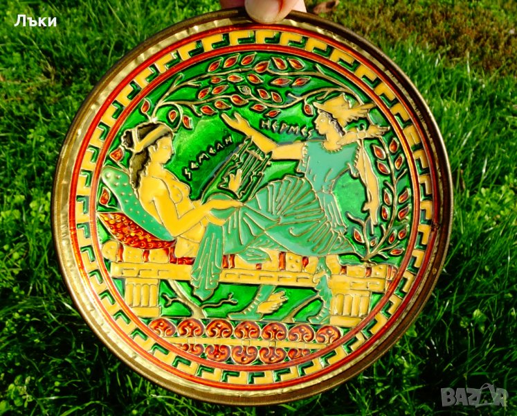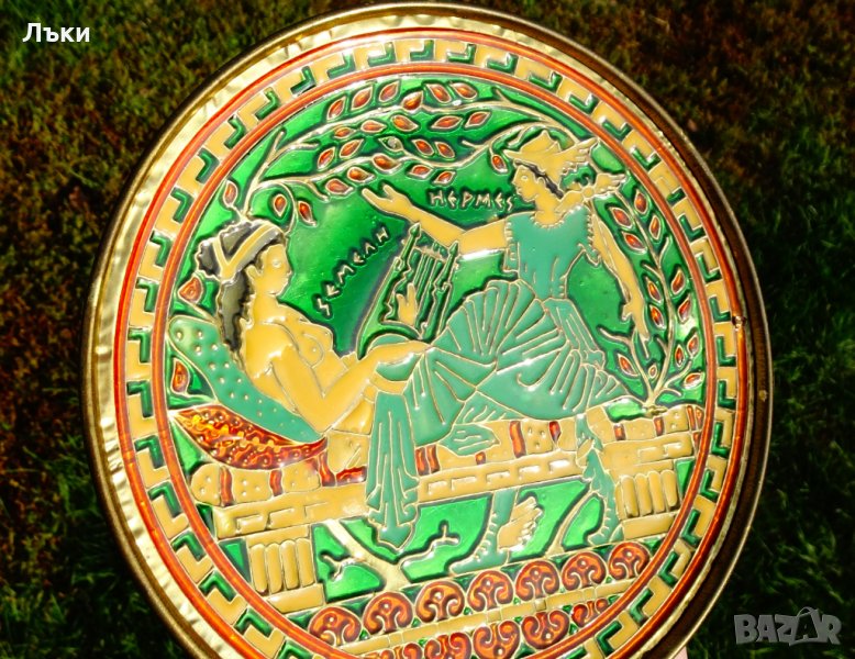 от масивен бронз и мед.Паното изобразява сцена от древногръцката митология с Бог Хермес и Семела – майката на Дионис.Картината е изработена в стил арабеска с цветен клетъчен емайл Клоазоне - enamel cloisonne.Цветовете са получени от различни скъпоценни камъни, естествени