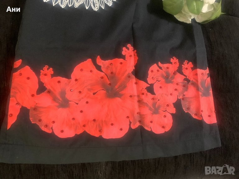 Обличана 1-2 пъти.Стои страхотно.Отстрани има 2 скрити джоба.Цветята са покрито с камъни.Тъй като плата няма никаква еластичност отстрани р леко разширявана, снимала съм.Размер С.