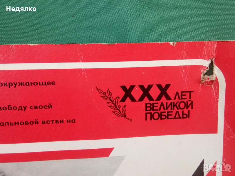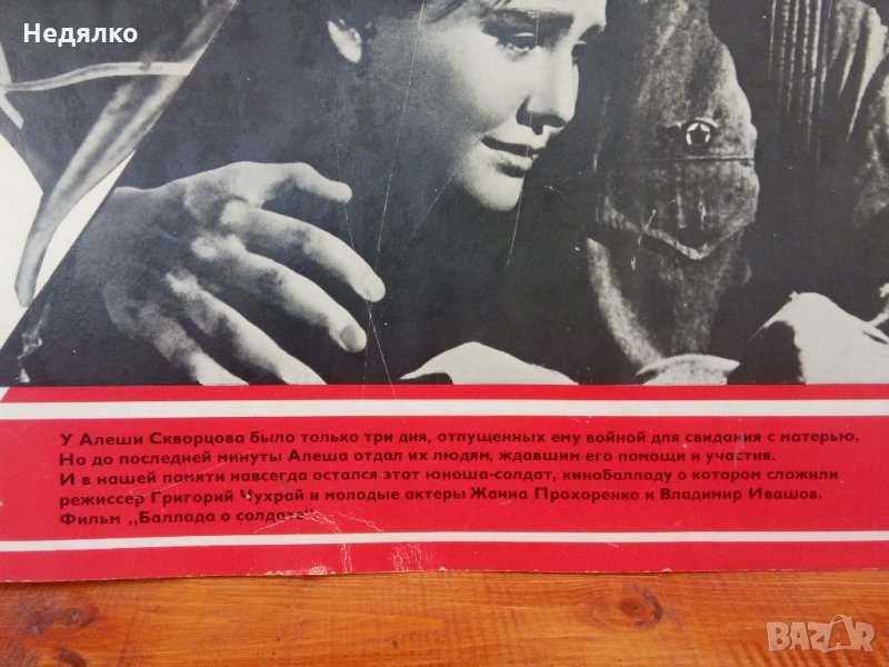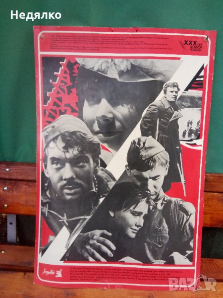 Руски,юбилеен,от 1975г,правени за износ в състояние от снимките,дебела качествена 1мм хартия,89,7х60 см.,по случай 30г от победата над Германия,за филмите- "Летят жерави"- златна палма от фестивала в Кан същата година и "Балада за войника",супер редкаж,за ценители,моля ,да се обаждат само сериозно заинтересовани ,желаещи наистина да притежават плаката!