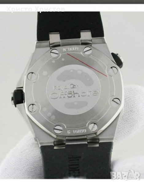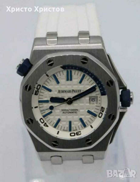 Луксозен ръчен часовник реплика Audemars Piguet Royal Oak, механичен, автомат, ефектен бял циферблат с дата в позиция 3 часа, фосфоресциращи стрелки, двуцветни маркери, L316 полиран стоманен корпус и черна каучукова каишка с оригинално закопчаване.