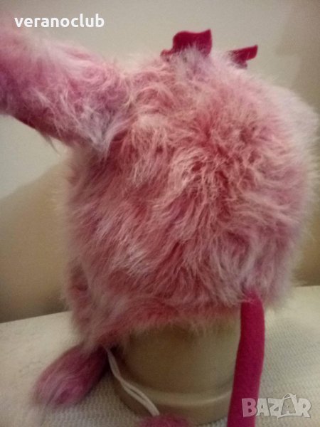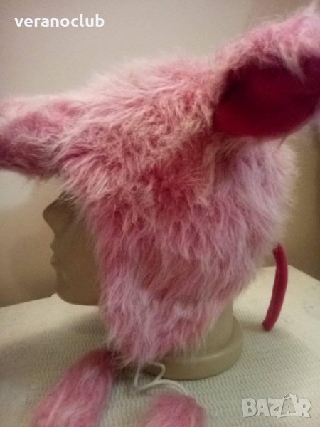 Интересна, закачлива и топла шапка от еко пух и подплата от полар, изобразяваща глава на прасе с муцунка, уши и опашка. Шапката е ушанка - покрива ушите и завършва с две шнурчета с помпони.