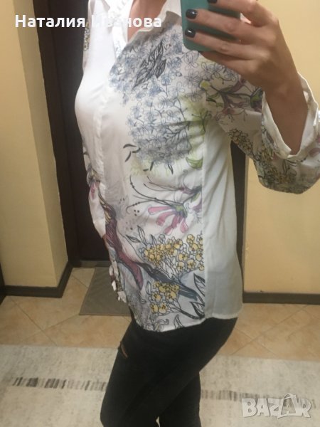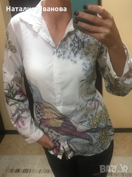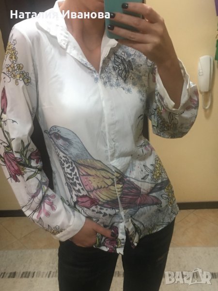Продавам дамска риза с интересни рисунки по нея , с копчета на ръкавите , леко прозрачна. Няма забележки по външния вид. Не се разменя за друга стока.