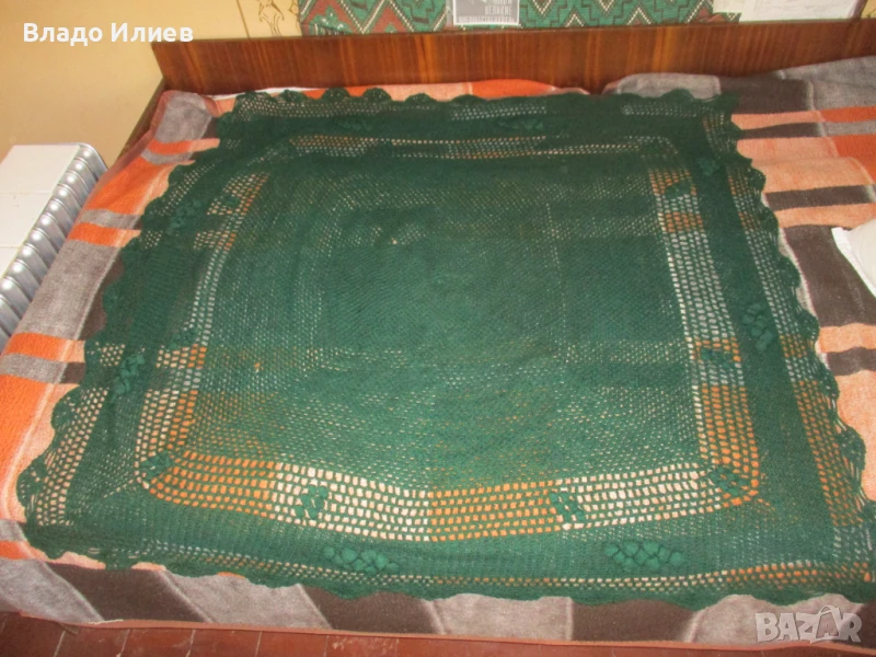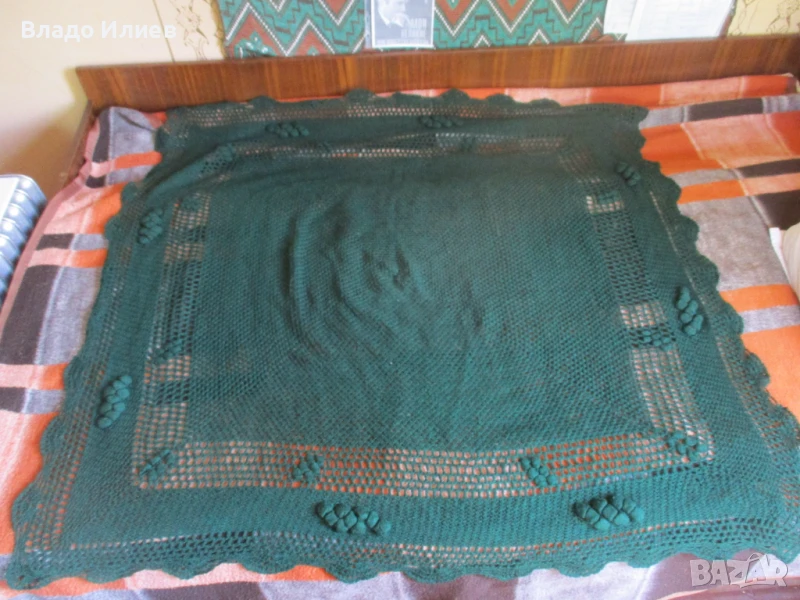 Зелената покривка на 9-та до13-та снимка е неизползвана,ръчно плетена,от вълна,размери 140/140 сантиметра.