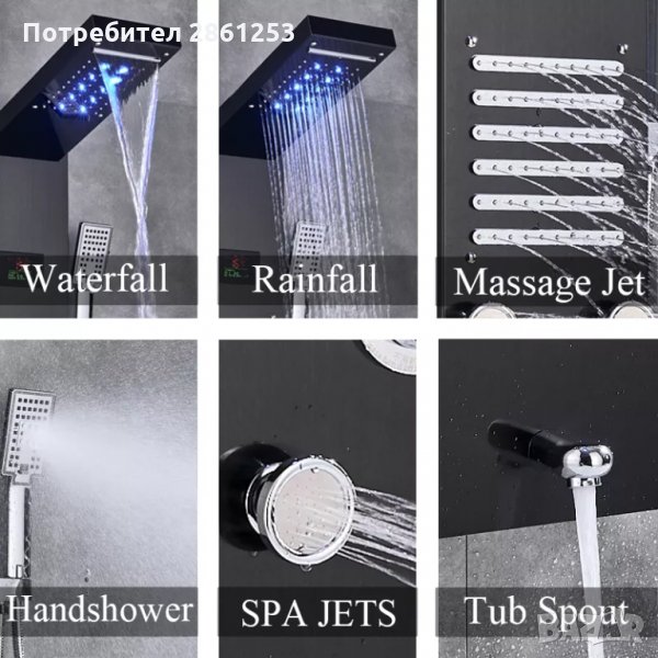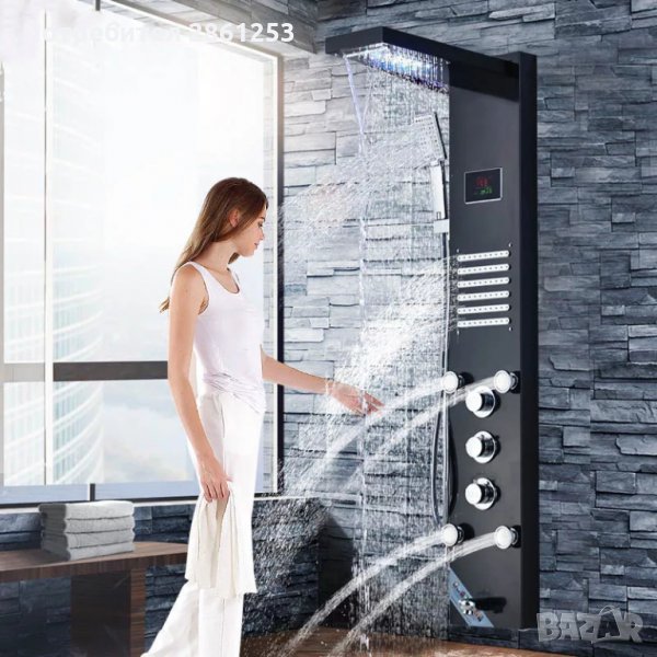 Душ панел с 5 функции. Лесен и бърз монтаж. Наличен в сив, черен и златист цвят. Свързване с водопровода посредством стандартни гъвкави връзки за топла и студена вода. Лед светлината, както и дисплея с температурата и времето са автономни, и не се нуждаят от батерии или ел. свързване. Точните размери може да видите на снимките. Панелите се доставят запечатани, добре опаковани и защитени от удар при транспорт. Изпращам с опция преглед преди плащане! БЕЗПЛАТНА ДОСТАВКА до офис на куриерска компания Спиди в рамките на един работен ден!