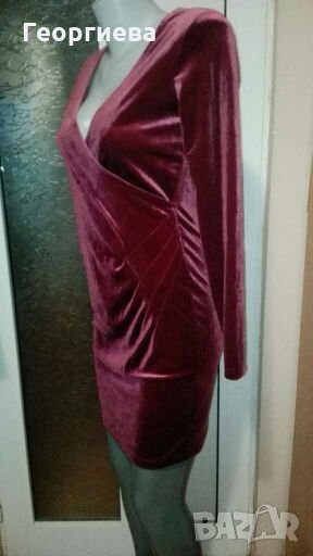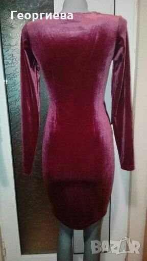 Нова, без хартиен етикет.Цветът е като на снимките.Има еластичност до S/M, т.е 38 р-р.Много качествено меко кадифе!Роклята е вталена и полата е тип „молив” - надолу се скосява.