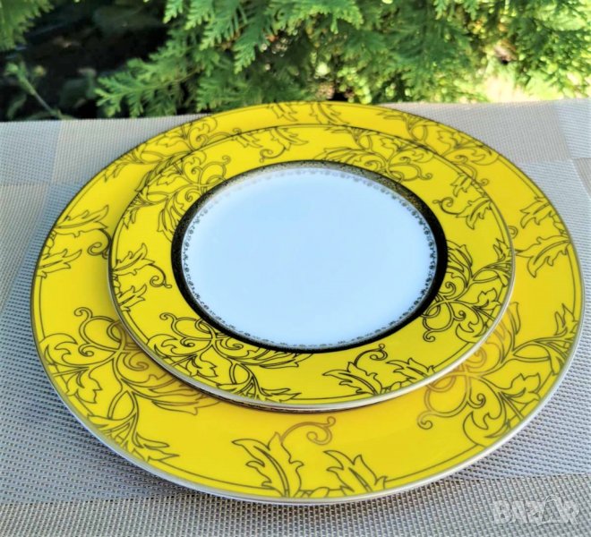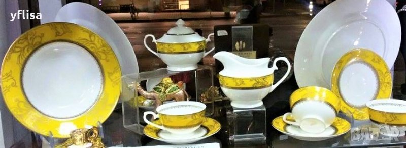 Луксозен, висококачествен комбиниран сервиз за хранене в слънчево жълт цвят. Изработен от костен порцелан ”YoLiSa” с богата, ръчно поставена подглазурна декорация от злато.