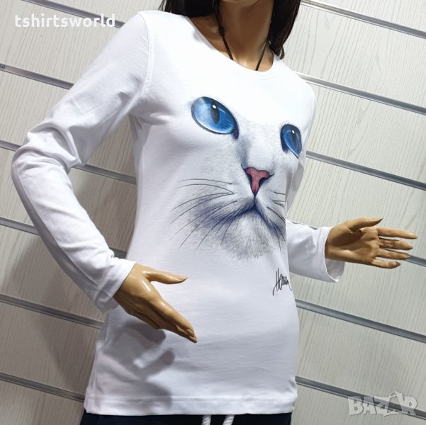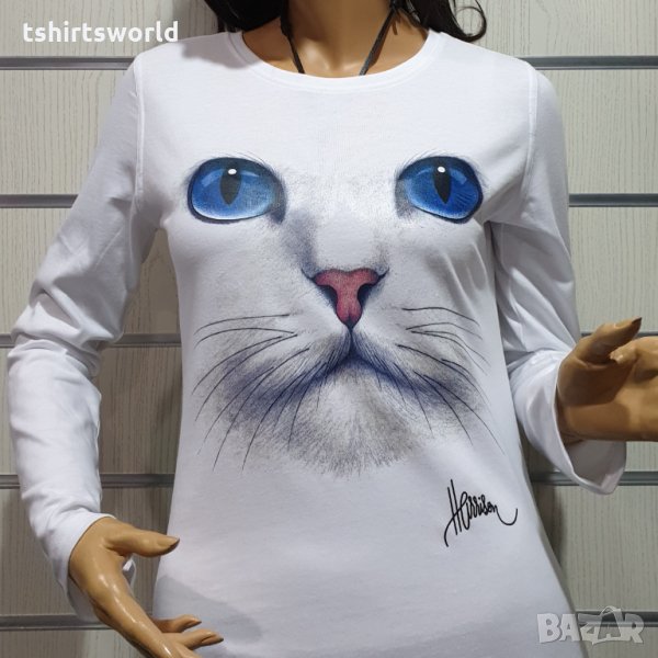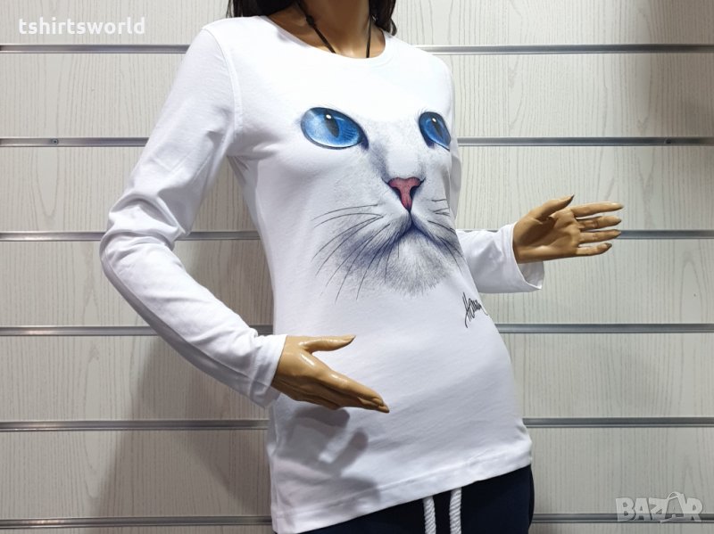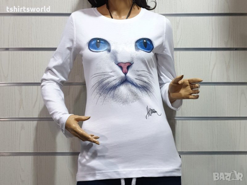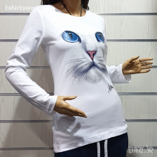 Страхотна нова бяла дамска блуза с дълъг ръкав с професионално изработен висококачествен 3D дигитален печат Котка със сини очи, устойчив на пране с години. Блузата е изработена в България под марката PRINTEX от висококачествен 100% пениран памук, който запазва цялостта на материята и наситеността на цветовете дълго време. Може да се пере при температура до 40 градуса. Спокойно можем да гарантираме за качеството на изработката и ярките цветове на дизайна.