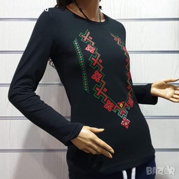 Страхотна нова черна дамска блуза с дълъг ръкав с професионално изработен висококачествен трансферен печат с Етно мотив, Шевица, България, устойчива на пране с години. Блузата е изработена в България под марката PRINTEX от висококачествен 100% пениран памук, който запазва цялостта на материята и наситеността на цветовете на черното трико дълго време. Може да се пере при температура до 40 градуса. Спокойно можем да гарантираме за качеството на изработката и ярките цветове на дизайна.