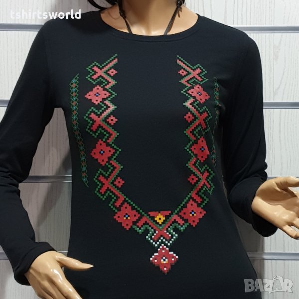 Нова дамска блуза с дълъг ръкав с трансферен печат Шевица, Етно мотив, България
