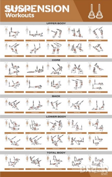 TRX Комплектa съдържа: тренажор с две двойни дръжки, лента за окачане посредством карабинер, две отделни каишки за удължаване, котва за врата и чанта за съхранение и пренасяне.