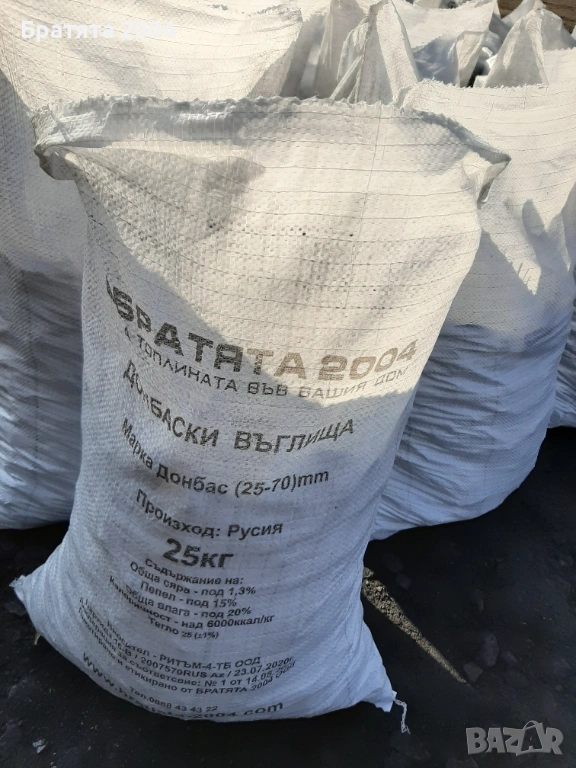Първокачествени Донбаски въглища със сертификат за качество съвпадащ със партидата на всеки чувал, цена на дребно е 9.20€ за чувал 25кг.