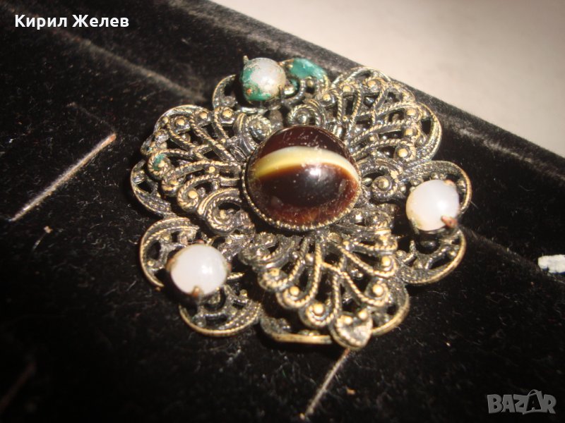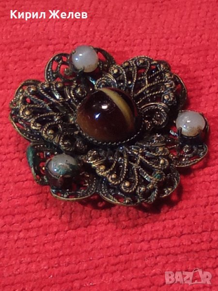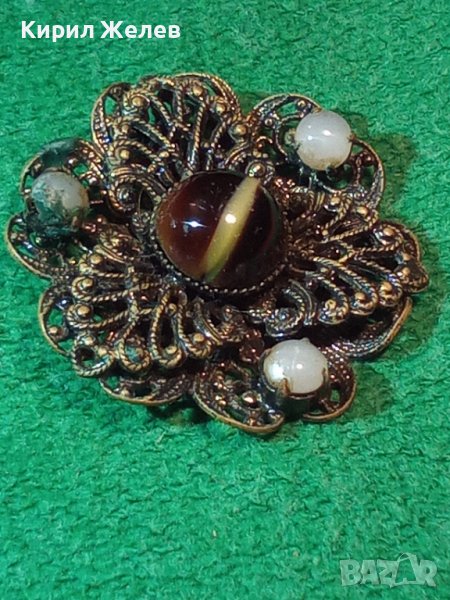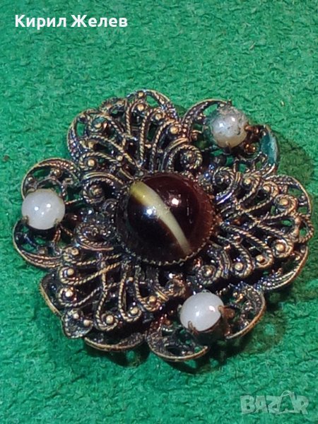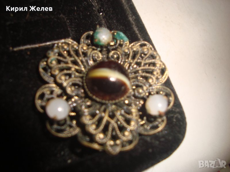 СТАРИННА БРОНЗОВА ФИЛИГРАННА БРОШКА с ЯСПИС и ПЕРЛИЧКИ АРТ ДЕКО 1921