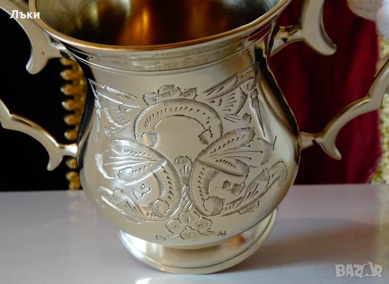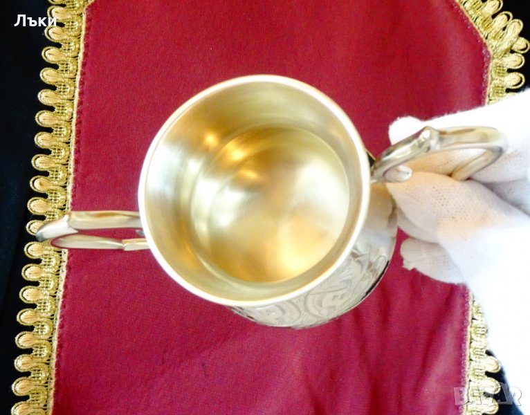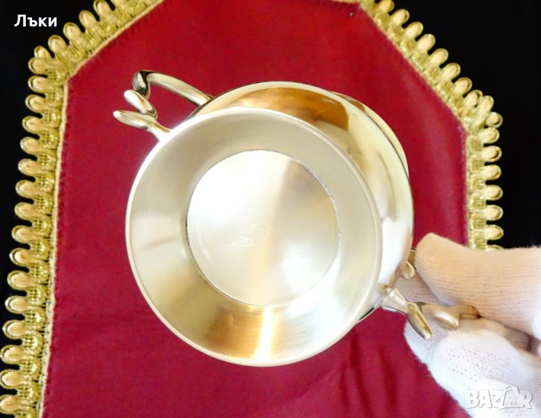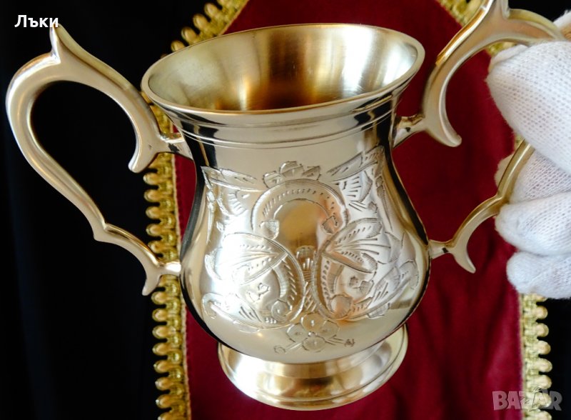 изработка от масивен високо качествен бронз с ослепителен блясък.Маркирана от производителя.Декорирана с най-красивите релефно гравирани барокови орнаменти и цветя.Височина 11 см.,дължина с дръжките 14 см.,диаметър 8 см.,тегло 260 гр.Вместимост 250 мл.