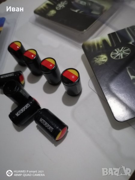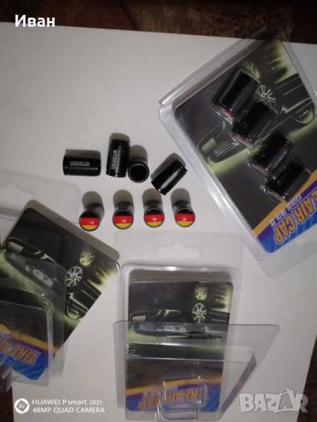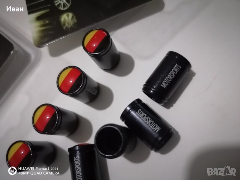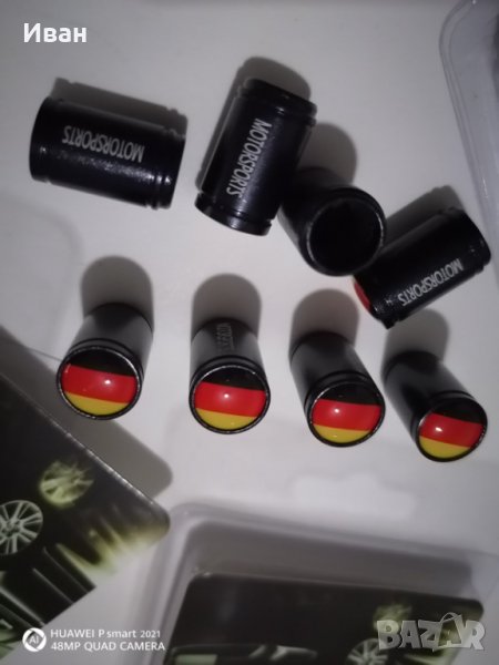 Продавам качественни черни метални капачки за вентили с емблеми на Алпина Alpina и с емблема на знамето на Германия Germany.
