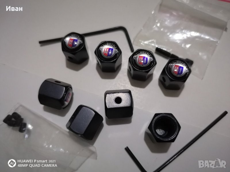 1. Комплект от 4 броя капачки метални черни за вентили на гуми с гумени вътрешни уплътнители и защита от кражба с емблеми на Алпина Alpina ,5 броя винтчета и ключе за тях - 10 лв.