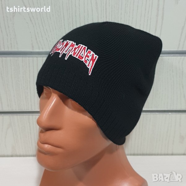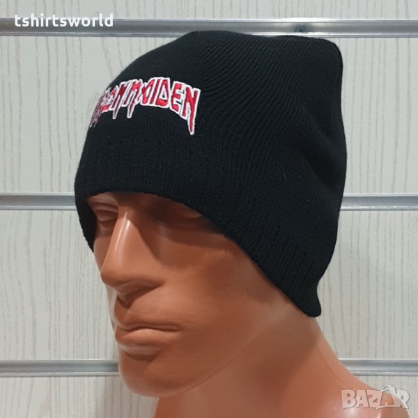 Уникална, функционална, универсална, стилна и модерна нова зимна черна шапка на музикалната група IRON MAIDEN с червен надпис.
