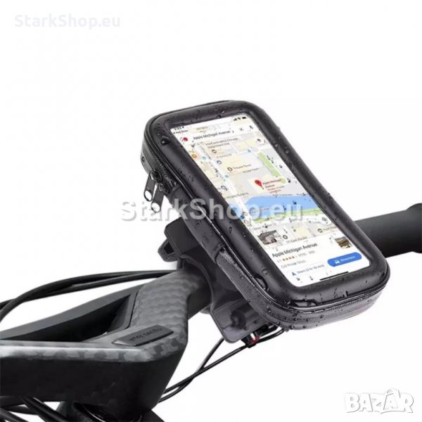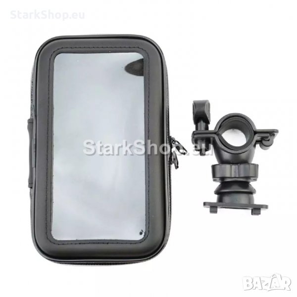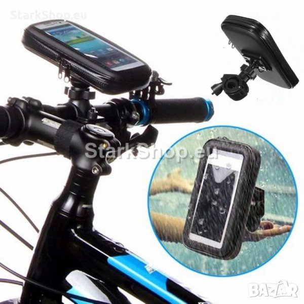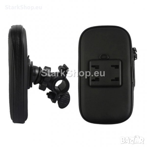 Водоустойчива стойка за телефон подходяща за монтаж на велосипед, мотор, скутер, тротинетка или друго превозно средство с ръкохватка.
