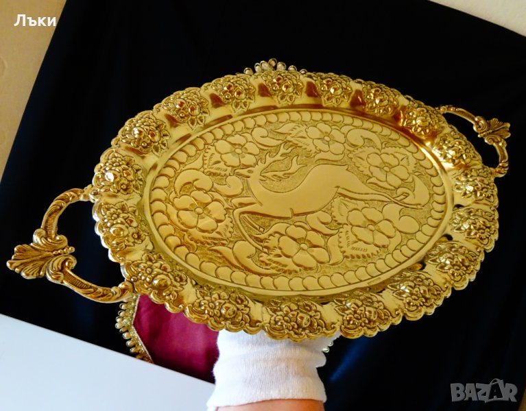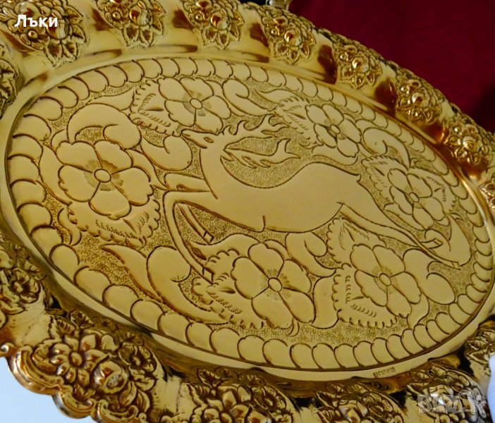 изработка от златен як бронз,маркиран.Има релефно кован ловна картина - Елен,сред разцъфнали цветя и орнаменти.По края декориран с релефни букети от цветя и