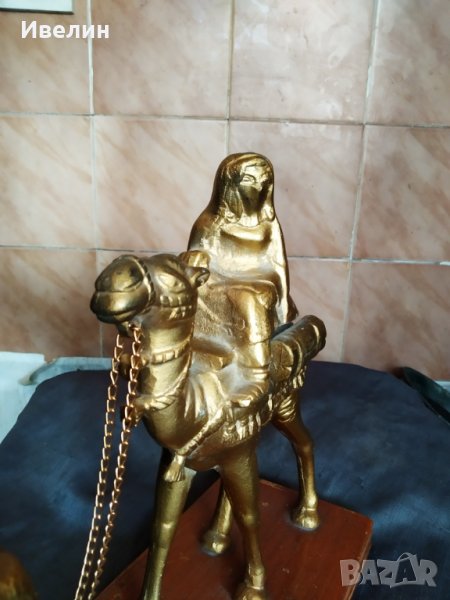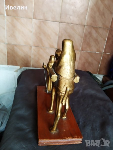 фигуративна композиция,статуетка.дървена основа с размери 11см/29см.металнифигури-мъжът е висок 16см,камилата е 26см/18см.