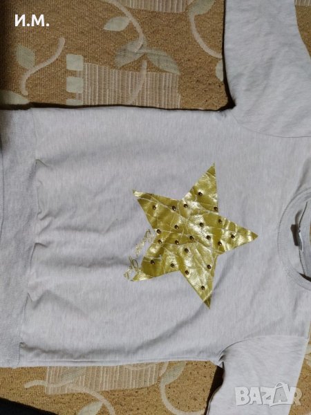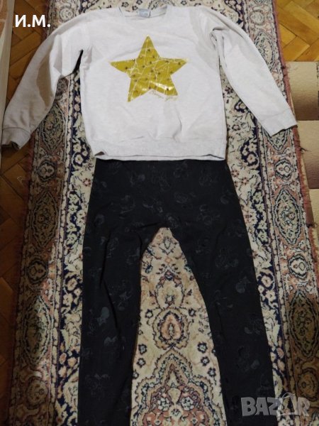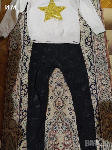 В отлично състояние са. И двете са много удобни, клинчето е меко,става за студено време. Блуза: дължина 53см, ръкав 48 см, мишници макс. 50см. Клин: дължина 77см, от чатал 55см. В талията се разтяга доста, до макс. 50см. Едното за 7лв, комплекта за 12лв.