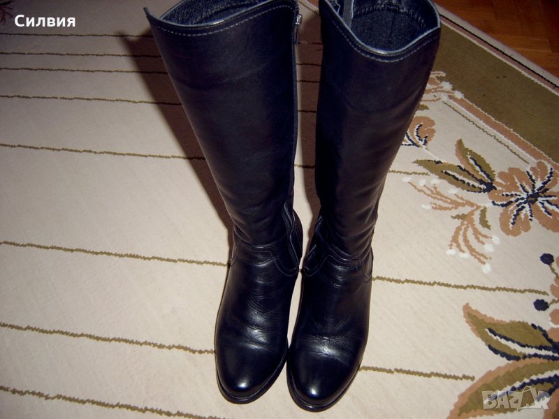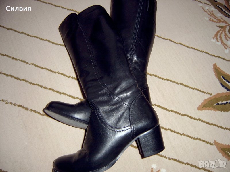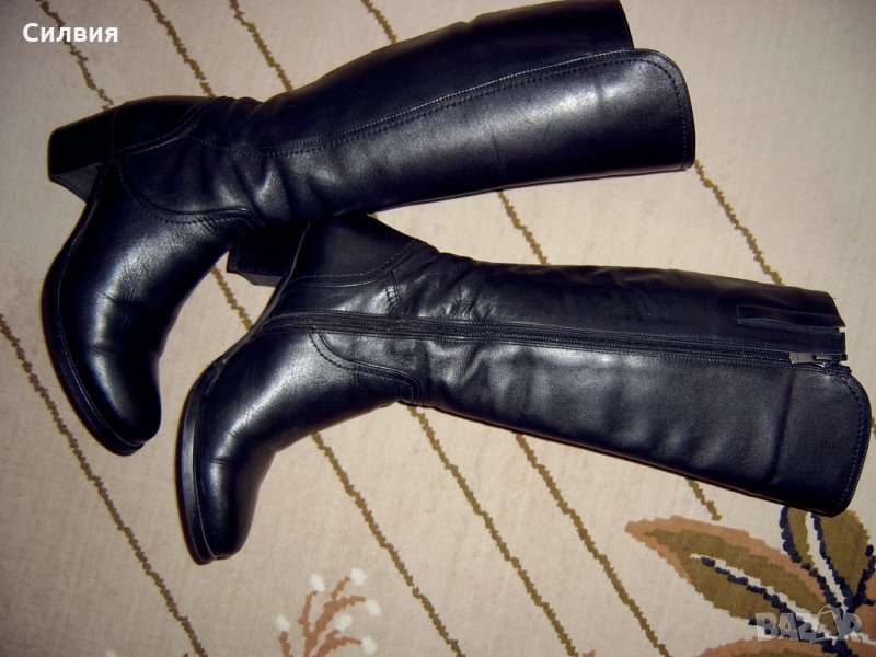 Черни ботуши естествена кожа, стоят елегантно по крака. Високи 37/38 см, обиколка в глезена 25/26 см, обиколка горе 36/37 см, височина на тока 5 см. Доколкото успях да измеря стелката 24.5 - 24.7 см. Носени около месец не интензивно. Отлично състояние, без забележки. Цена 80 лв.