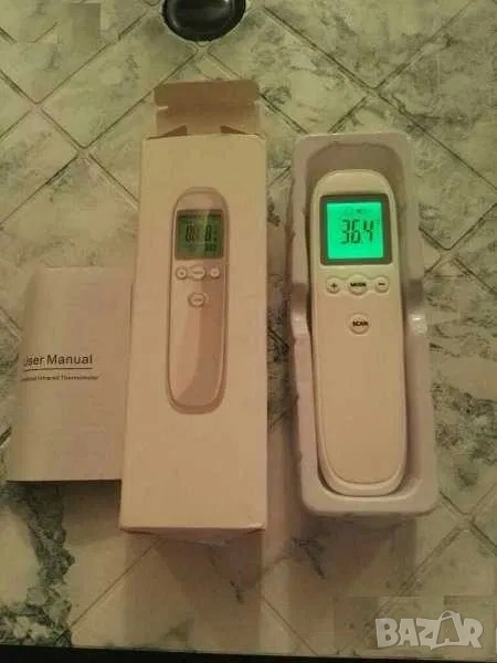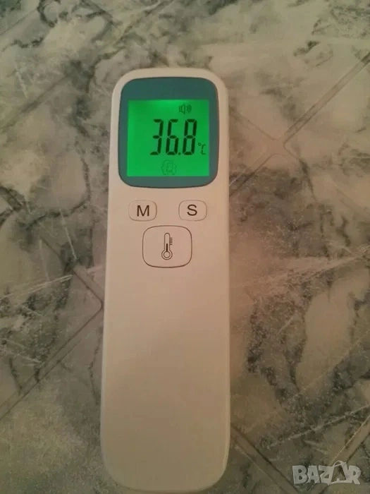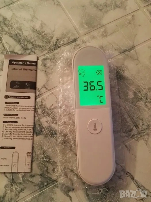 4. Продавам безконтактен инфраред термометър с LCD дисплей, измерва телесна температура и температурата на предмети. Има три цвята на подсветка на дисплея - зелен, жълт и червен в зависимост от измерената температура. Показва температурата в С и F. Разстояние от обекта за измерване между 3см и 5см, точност ±0.2°С. Диапазон за телесна температура между 32°С и 42.9°С. Диапазон за температура на предмети между 0°С - 100°С. Показва последните 32 измерени стойности (запазват се в паметта) .Индикатор за нивото на батерията. Включени са инструкции за употреба. Работи с 2бр. батерии ААА, които не са включени в комплекта. Цвят бял. Снимки 7 и 8.
