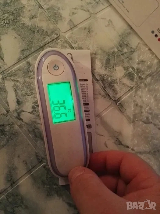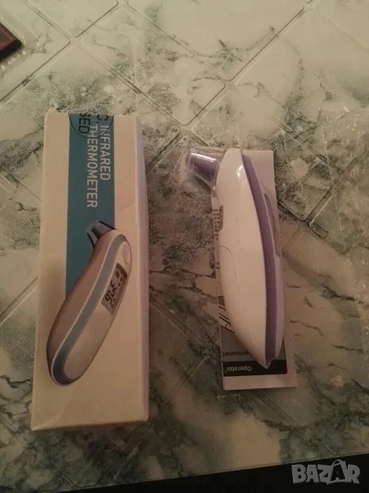 3. Продавам безконтактен инфраред термометър с LCD дисплей, измерва телесна температура, температурата в ухо и температурата на предмети. Има три цвята на подсветка на дисплея - зелен, оранжев и червен в зависимост от измерената температура. Показва температурата в С и F. Разстояние от обекта за измерване между 3см и 5см, точност ±0.2°С. Диапазон за телесна температура между 32°С и 42.9°С. Диапазон за температура на предмети между 5°С - 80°С. Звуков сигнал при измерване на температура. Индикатор за нивото на батерията. Включени са инструкции за употреба. Работи с 2бр. батерии ААА, които не са включени в комплекта. Цвят бял с лилаво. Снимки 5 и 6.