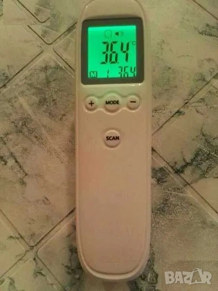 2. Продавам безконтактен инфраред термометър с LCD дисплей, измерва телесна температура и температурата на предмети. Има три цвята на подсветка на дисплея - зелен, оранжев и червен в зависимост от измерената температура. Показва температурата в С и F. Разстояние от обекта за измерване между 3см и 5см, точност ±0.2°С. Диапазон за телесна температура между 32°С и 42.9°С. Диапазон за температура на предмети между 5°С - 80°С. Звуков сигнал при измерване на температура. Индикатор за нивото на батерията. Включени са инструкции за употреба. Работи с 2бр. батерии ААА, които не са включени в комплекта. Цвят бял. Снимки 3 и 4.