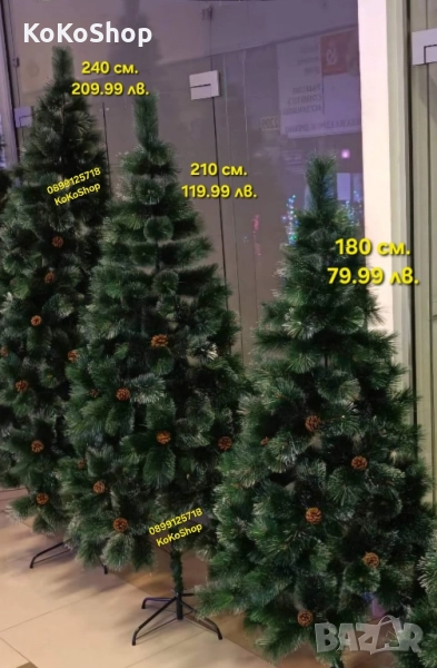 Красиви и изключително реалистични изкуствени коледни елхи. Предлагат се в два варианта-в класически зелен цвят и зелени с бели връхчета. Елхите са със стабилна стойка,а размерите от 120 см. до 300 см. са декорирани с шишарки.