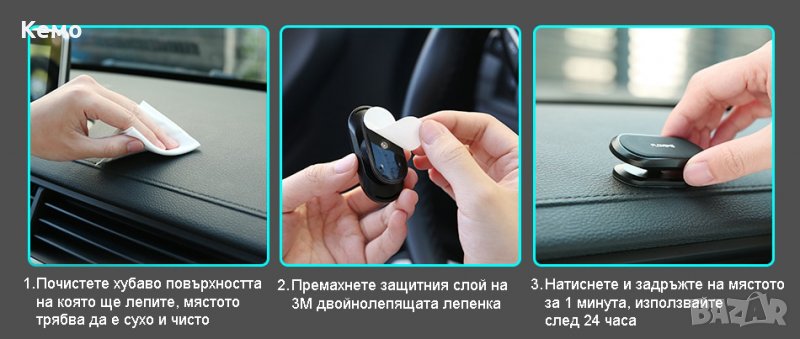 Използването е много удобно – в комплекта има металната пластинка която се залепва на гърба на телефона или се слага под калъфа, за да се захване на държача трябва само да се приближи смартфона към държача.