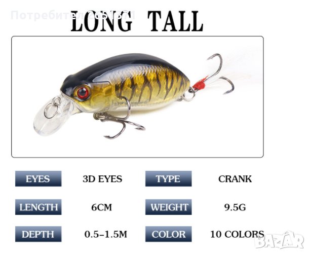 воблери, изкуствена примамка с перо на задната кука, 3D очи и топчета за звуков ефект- 9,5 гр., 6 см., гази от 0,5 до 1,5 метра