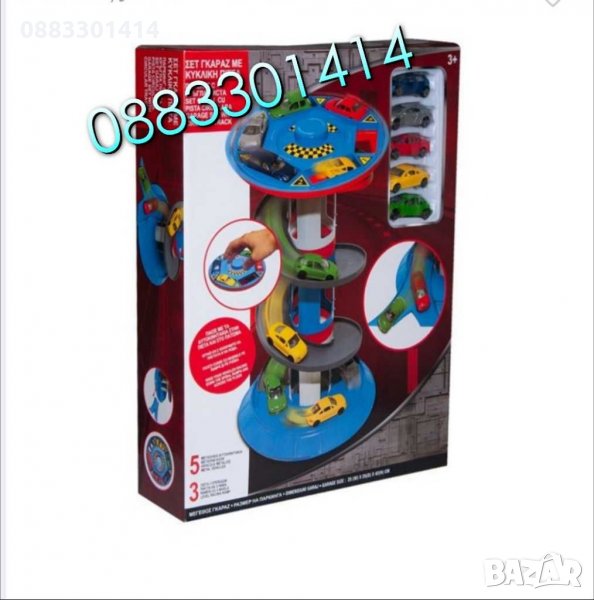 Детски комплект - паркинг с кръгла писта на 3 нива и 5 метални автомобила в различни ярки цветове.
