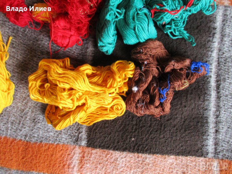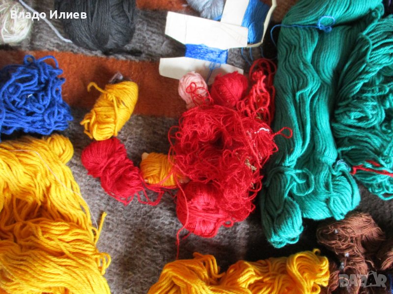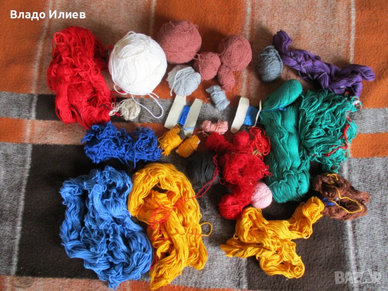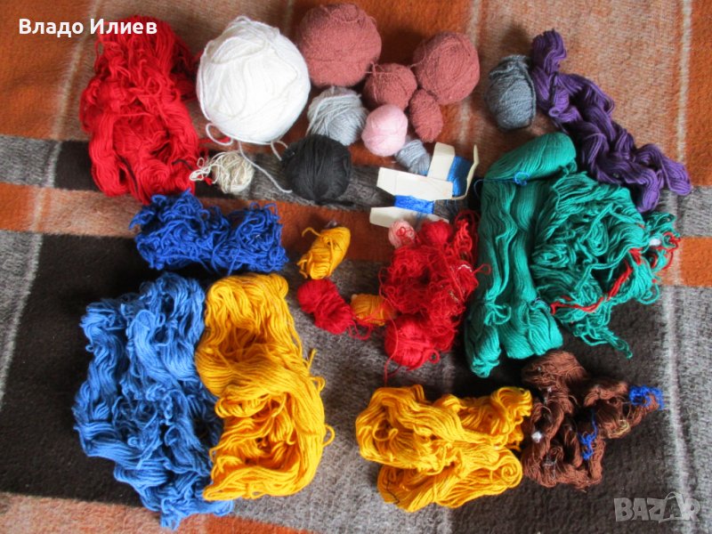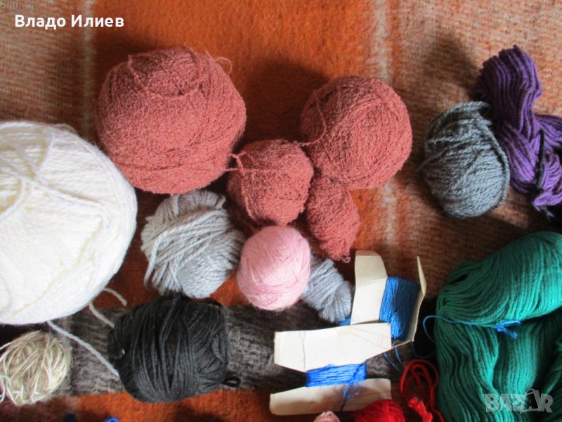 Преждата е останала от майка ми...С различни цветове и отлично качество е.Има и куки за плетене.Размер на куките:3 големи с топче накрая-35 см,3 бели с кабел-14,3 двойни с кабел-1брой -13 см,2 броя двойни с кабел-11 см,2 броя по 21 см,8 броя по 19 см,6 броя по 18,5 см,6 броя по 18 см,2 броя по 13,5 см.Общо 35 броя куки.10-те гранчета черна прежда е тип "Мохелен"-вижте снимките на оригиналните етикети.