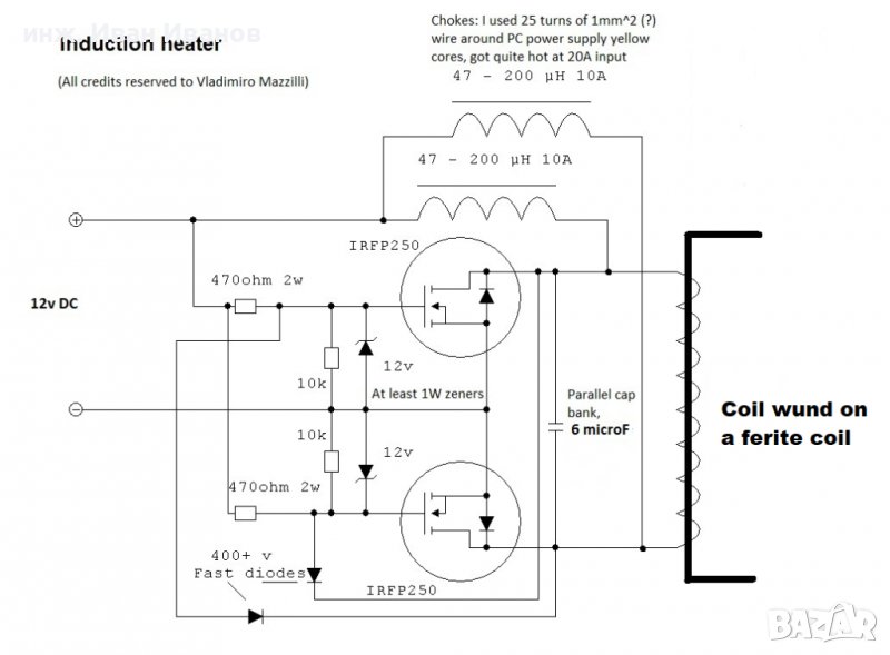 С една половинка от този феритен к-т може да си направите индуктор за индукционно нагряване. За целта се използва парче силиконов многожилен проводник 4 кв.мм (има го в електро-магазините - ползва се за свързване на нагреватели). Намотава се колкото събира половинката от феритната чаша и се залива с епоксидна смола или термоустойчив силикон. Можете да навивате намотки както вътре в чашата така и отвън по повърхността, ако е необходимо.Електрическата схема на генератора е дадена на последната снимка.