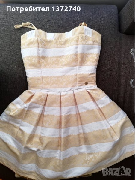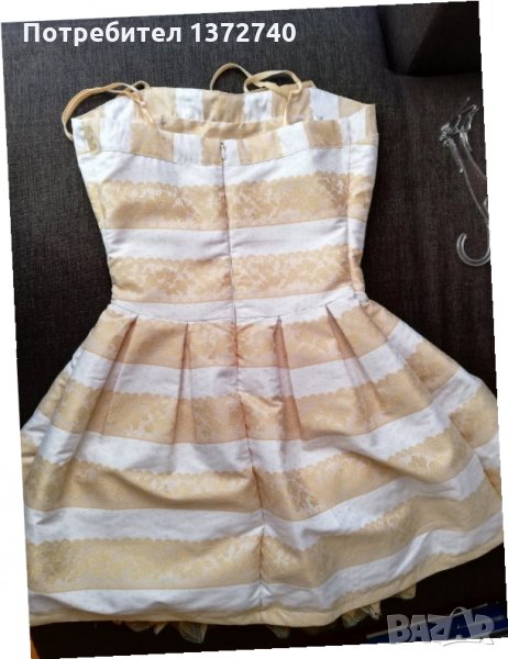 Прекрасна официална рокля, в бяло и златно, размер "S". Модела е с тънки презрамки и разкроена долна част, която има подплата от тюл.