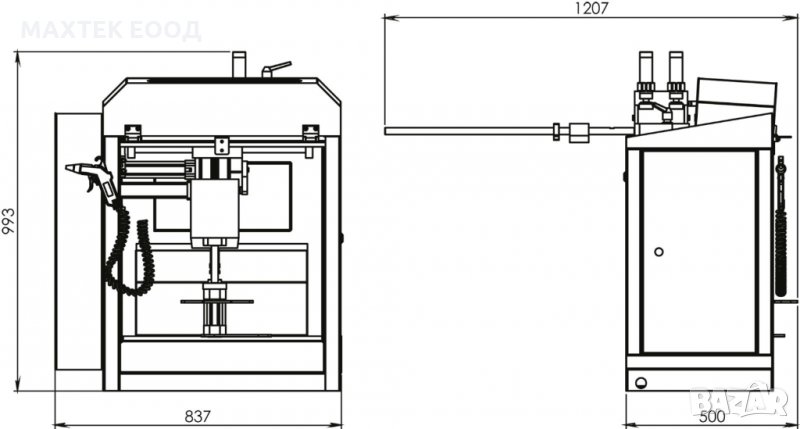 - Максимална обработваема ширина на профила: 90 ° – 120 mm; 45 ° – 90 mm