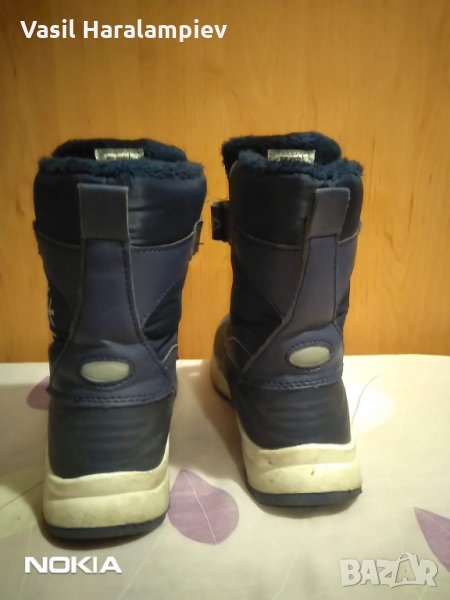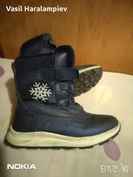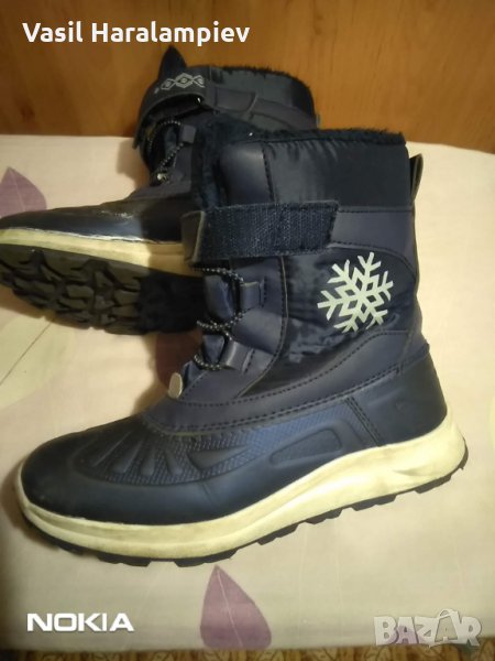 Апреските са от Лидъл и са носени около два месеца, до училището детето ходи с кола. За момиче номер 34 за 10 лева. Размера на стелката е 23 см, има изолация с алуминиево фолио отдолу. Най- горе има слепка, а надолу е ластик. Цвета е тъмно-син.