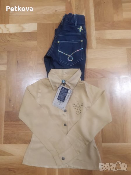 Нов комплект и за подарък също. Страхотен модел и кройка. Размери на ризката дължина 41см, ширина м/у рамене27см, ширина под мишн.32.