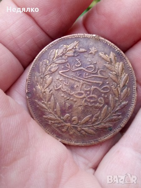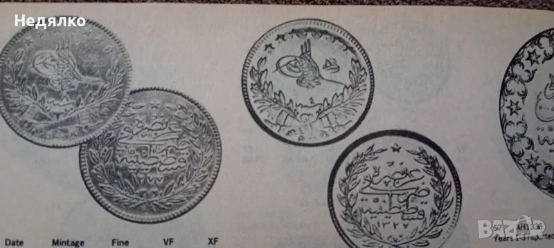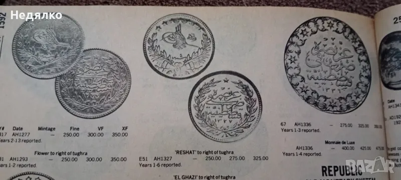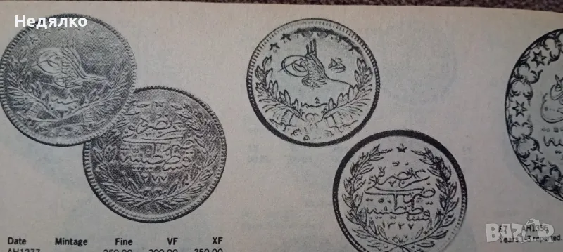 Мед в състояние от снимките,добра монета,естествена патина,не почиствана,500 куруш,16,39грама,35мм диаметър,2мм дебелина,назъбен гурт,била е запоявана на колие, много внимателно,следите от това са видни,,изключително рядка монета.Султан Абдул Азиз,познати само златни.Медна ,като моята не открих,това е образец,отсичан преди златните.И още нещо интересно в допълнение,на единствена златна такава няма символ от дясно на туграта-"Reshat",а тази има,има го в емисията от 1327г,прилагам снимка от каталога ми за световните монети от 1979г на Chester L. Krause and Clifford Mishler.Повече на телефона, за сериозни!