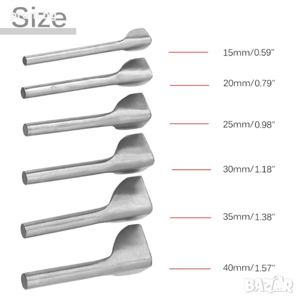 V образна замба, щанца за ъгли на чанти, колани, каишки на часовници и др. Размери: 15 мм; 20 мм; 25 мм; 30 мм; 35 мм; Материал: висококачествена стомана, устойчива на износване. С остри, полирани ръбове и здрава дръжка.