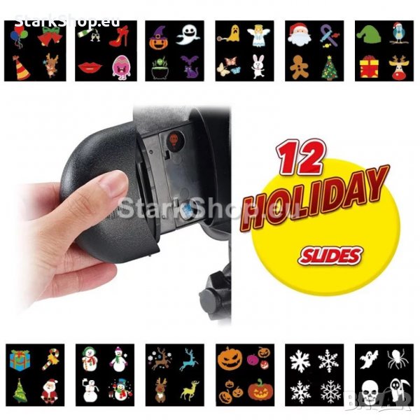 Превърнете дома си в истинска светлинна атракция с най-новият модел 2020 лазерен SlideShower коледен прожектор с 12 различни приставки за всеки празник!