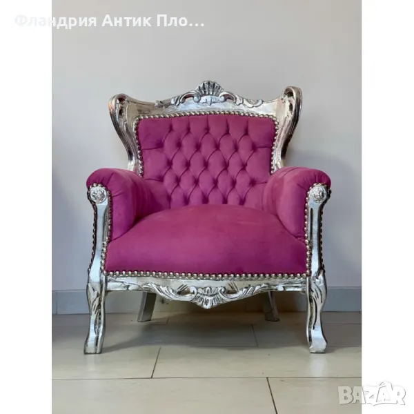 Изработка от масивно дърво, облечено в сребърен варак и тапицерия от розов плюш.
