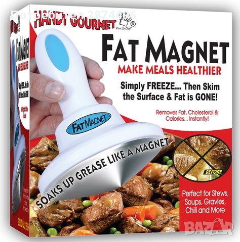 FAT MAGNET буквално е уред, който привлича мазнините към себе си и по този начин ги отделя от храната по съвсем лесен, и безопасен начин! Специално разработен за премахването на "плаващите мазнини" от супи, яхнии и други вкусотийки, които обичате да си похапвате.