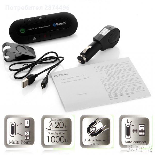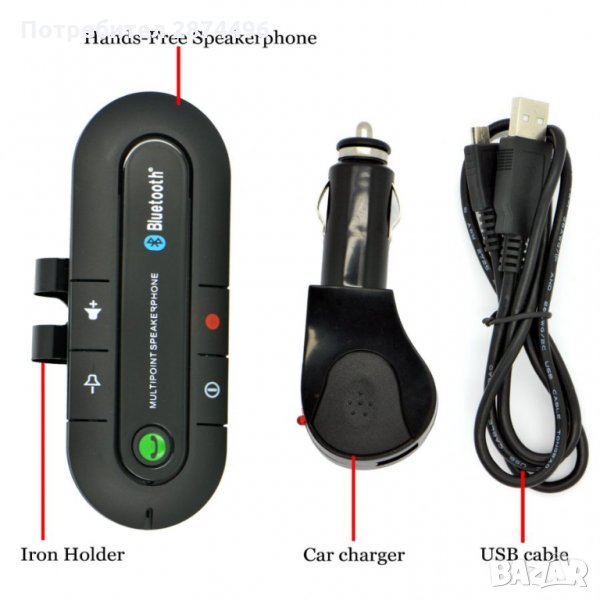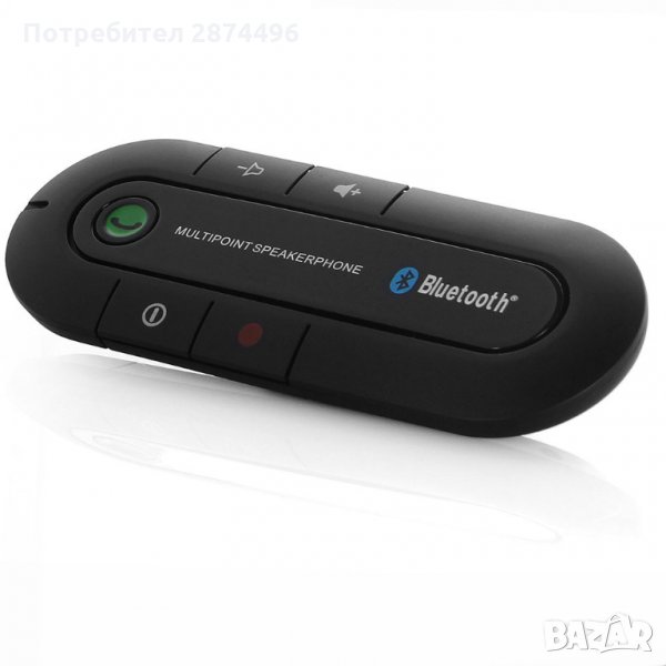 Bluetooth Hands Free Car Kit устройство за 2 телефона за разговори тип свободни ръце, с блутут свързаност.Идеално за вашия автомобил. Не ви е необходимо нищо допълнително за безопасни разговори в атомобила.Позволява връзка на 2 телефона едновременно. Вграден микрофон, вграден говорител, вградена батерия, подтискане на шума.Лесна монтаж, без инструменти и за секунди.Функции които се поддържат са:* Автоматично свързване* Приемане на разговор* Край на разговор* Отказ на разговор* Повторно набиране* Коригиране на звукСпецификации:Bluetooth V3.0, Class 2Работна обхват: до 10 метраРаботна честота: 2.4GHzВреме за разговор: до 20 часаВреме на готовност: до 1000 часаВреме за зареждане: 3 часаВградена акумулаторна батерия 3.7VDC, 500mAHРазмери: 149 х 49 х 14 mmТегло: 65 гр.Кутията съдържа:* Bluetooth Hands-Free Car Kit – 1 бр.* Зарядно за автомобил – 1 бр.* USB кабел – 1 бр.* Метална скоба за захващане – 1 бр.* Ръководство за употреба – 1 бр