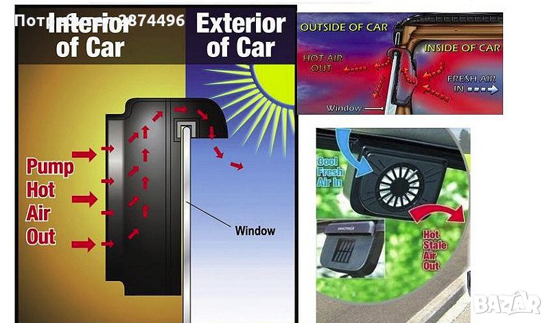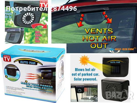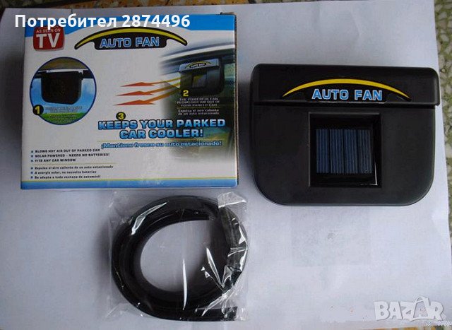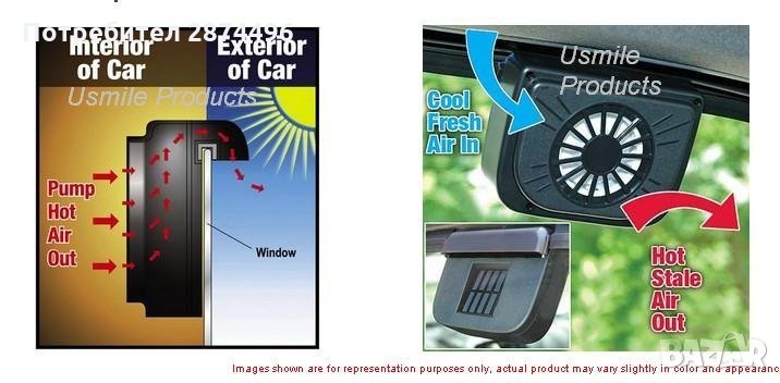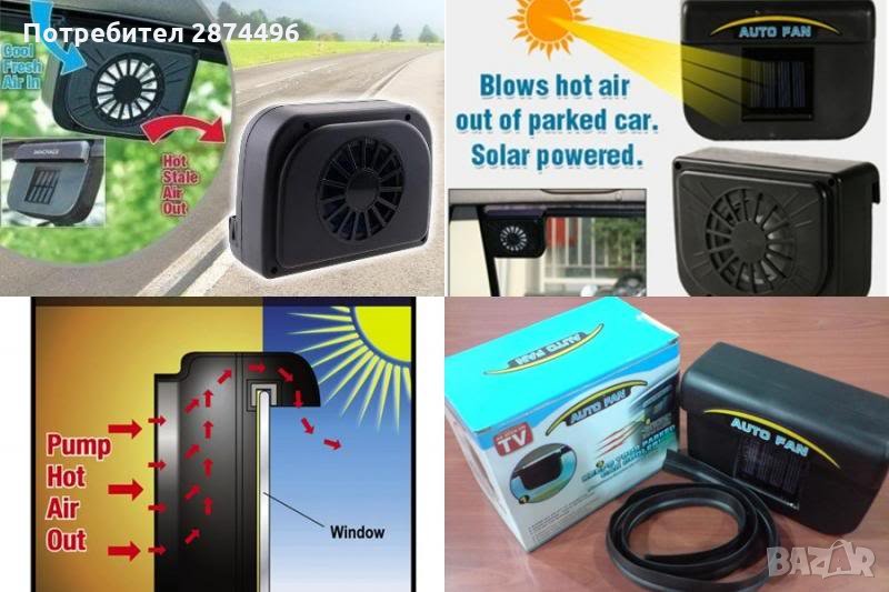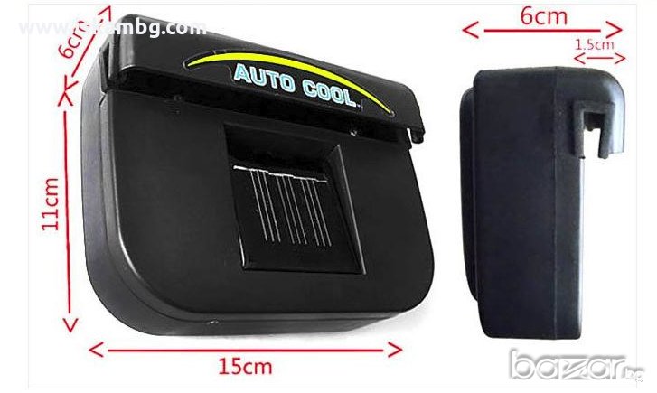 Лято е , горещо е, а Вашият автомобил няма климатик. Трудно намирате сенчесто място за паркиране.Решението е само едно- соларен вентилатор Solar auto fan!Той безопасно и ефективно помага да се оттървете от застоялия въздух във Вашия автомобил. Вентилаторът се захранва със слънчева енергия. Издухва горещия въздух навън, като същевременно вкарва свеж въздух вътре.Спомага за премехване на неприятни миризми от автомобила.И това напълно безплатно. С покупката на този соларен вентилатор спестявате не малко пари за поставяне на климатик в автомобила.Работи без батерии, не използва акумулатора, захранва се единствено от слънчевата светлина.Толкова е лесен за употреба- просто закрепете включените в комплекта уплътнения и поставете вентилатора на ръба на прозореца и го затворете. Соларния панел е на гърба на вентилатора , гледайки към светлината. Готов е за действие!Горещ въздух, миризми- премахнати!Пари за климатик- спестени!Сега се радвайте на лятото!Препоръки: Използвайте соларния вентилатор когато автомобила е паркиран. Използването му по време на шофиране може да затрудни работата му.Материал: пластмасаЦвят: черенРазмери: 15.5 х 11 смТегло: 0.365 кг