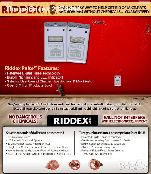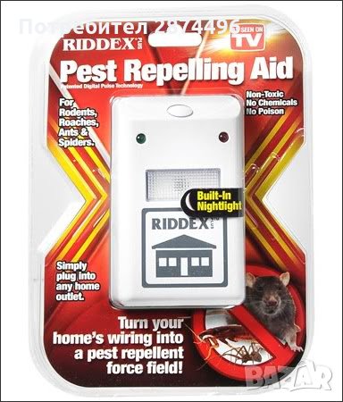 Почти всеки от нас е имал някакви неприятни ситуации, свързани с мишки или насекоми. Сега можете да оставите тези моменти в миналото и да се наслаждавате на спокойствие и чистота в дома си, както и работното си място, защото тук Ви представяме електронния уред за борба с домашни вредители Riddex! Той излъчва ултразвуков сигнал с променлива честота, която прогонва и защитва вашия дом от хлебарки, мишки, плъхове, комари, паяци и всякакви други гризачи и насекоми. Това е 130 dB ултразвуков сигнал, който атакува нервната система на домашните вредители. Той е изключително ефикасен, защото излъчва честота, която е вълнообразна т. е. променлива и така вредителите не могат да привикнат към нея. Той е напълно безопасен за хората и домашните любимци, с изключение на: хамстери, морски свинчета, джербили и други домашни гризачи! Уредът работи, когато се включи към електрическата мрежа, но е много икономичен, защото има почти нулева консумация на електричество. За да достигне оптималния си ефект трябва да се използва поне 2 седмици непрекъснато. Той е подходящ за помещения до 450 кв.м. Има светлинен индикатор, светещ в зелено, когато работи. Неговите размери са: 10 х 6 х 5см.
