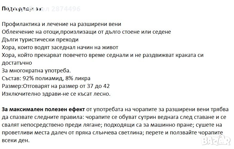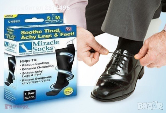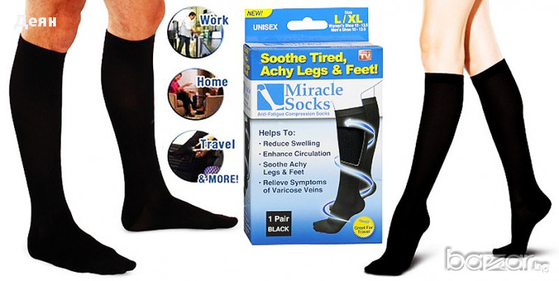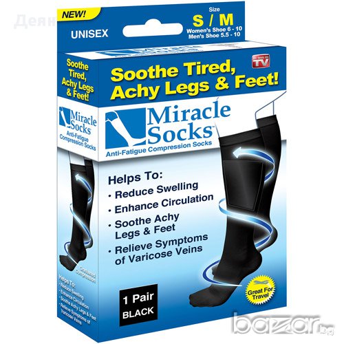 Страдате от разширени вени или работите седнали и вечер чувствате краката си уморени и отекли? Ако е така, то най-вероятно се нуждаете от ново средство за облекчение на болката - нашите нови, еластични компресионни чорапи Magic Socks з са може би точно това, от което имате нужда. Те подобряват кръвообращението и намаляват отока в областа на прасците и бедрата.Позволяват контролирано кръвоснабдяване в зоната на пръстите.Magic Socks подсигуряват точната степен на компресия, удобно пристягат в областта на глезените като компресията постепенно намалява нагоре по краката. Подходящи за:Профилактика и лечение на разширени вени;Облекчение на отоци,произлизащи от дълго стоене или седенеДълги туристически преходи;Хора, които водят заседнал начин на живот;Хора, който прекарват повечето време седнали и не раздвижват краката си достатъчно;За многократна употреба;Изключително здрави;За максимален полезен ефект от употребата на чорапите за разширени венитрябва да спазвате следните правила: чорапите се обуват сутрин веднага след ставане и се свалят непосредствено преди лягане; подходящи са за машинно пране; сушете на проветливи места далеч от пряка слънчева светлина; перете и ползвайте чорапите всеки ден.