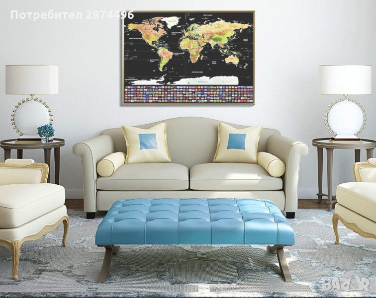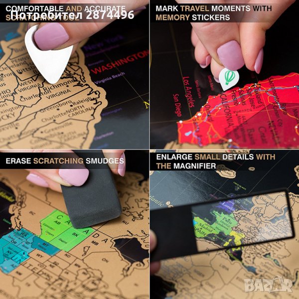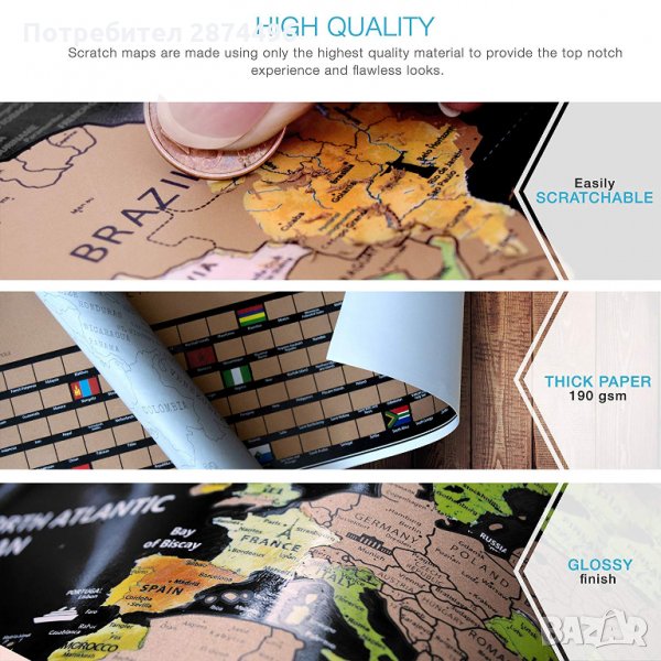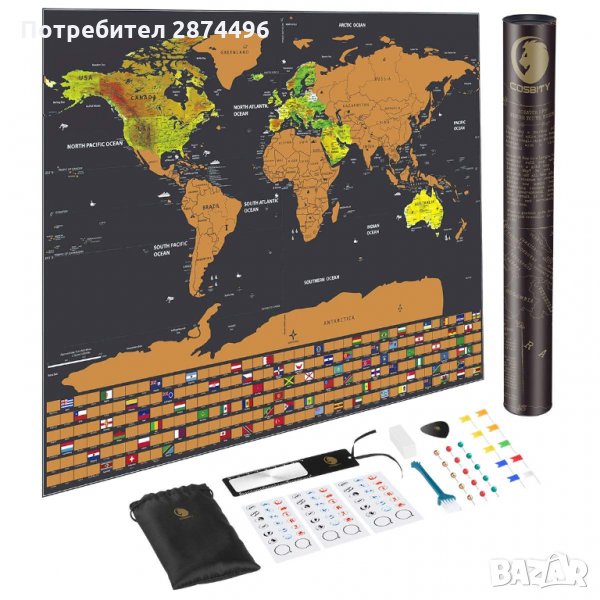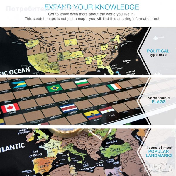 Световната, скреч карта в тази оферта притежава всички качества на класическата скреч карта на света като тук са добавени знамената на държавите които може да изстриете и научите в същото време.