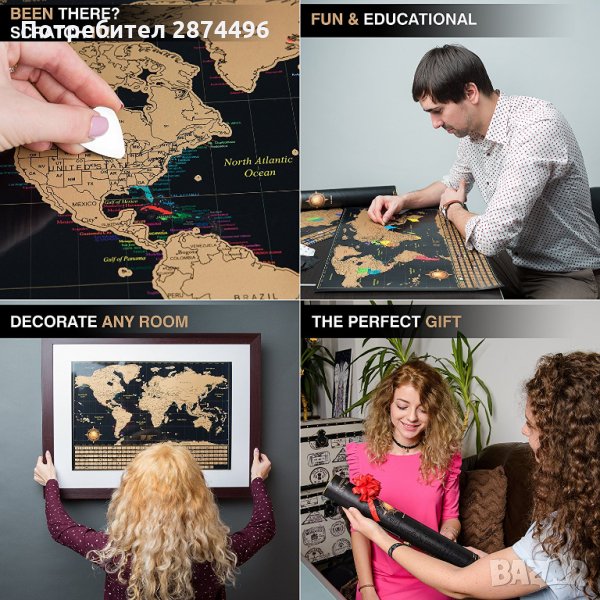 Карта, която се променя след всяко пътешествие до непознато място: Изтрий (с гумичка или монета) слоя със златисто скреч покритие от посетените места, за да разкриеш цветовете ѝ отдолу.